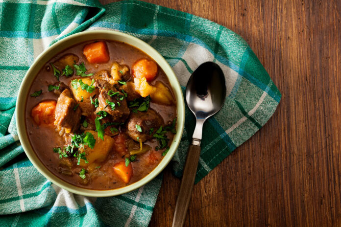- Sprinkle with flour and stir. Add beef broth. Bring to a boil and add parsnip, potatoes, and carrots.