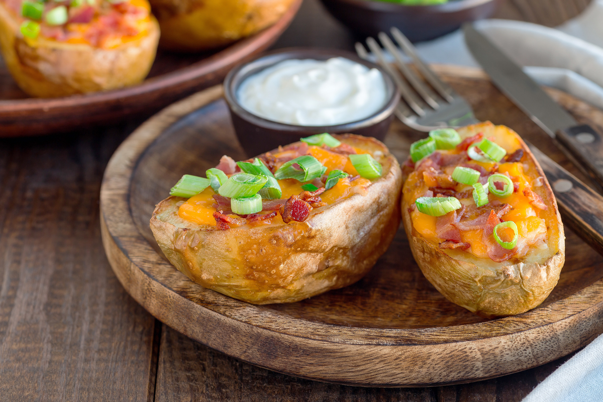 Baked loaded potato skins with cheddar cheese and bacon, garnished with scallions and sour cream horizontal