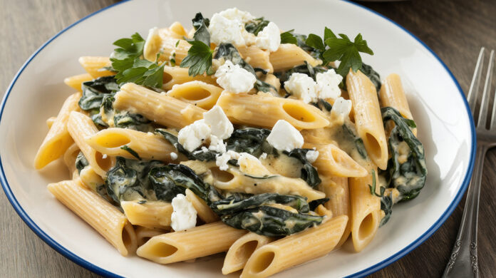 - Meanwhile, combine spinach, oil, garlic, dill, salt and pepper in a large bowl. Use your hands to mix the spinach until it’s reduced in volume by half. Stir in pasta. After the feta has baked for 15 minutes, add the spinach and pasta mixture to the baking dish. Pour boiling water over the mixture and gently stir. Cover with foil and bake until the pasta is tender, about 18 minutes. Remove from the oven and stir. Cover and let stand for at least 3 minutes before serving.