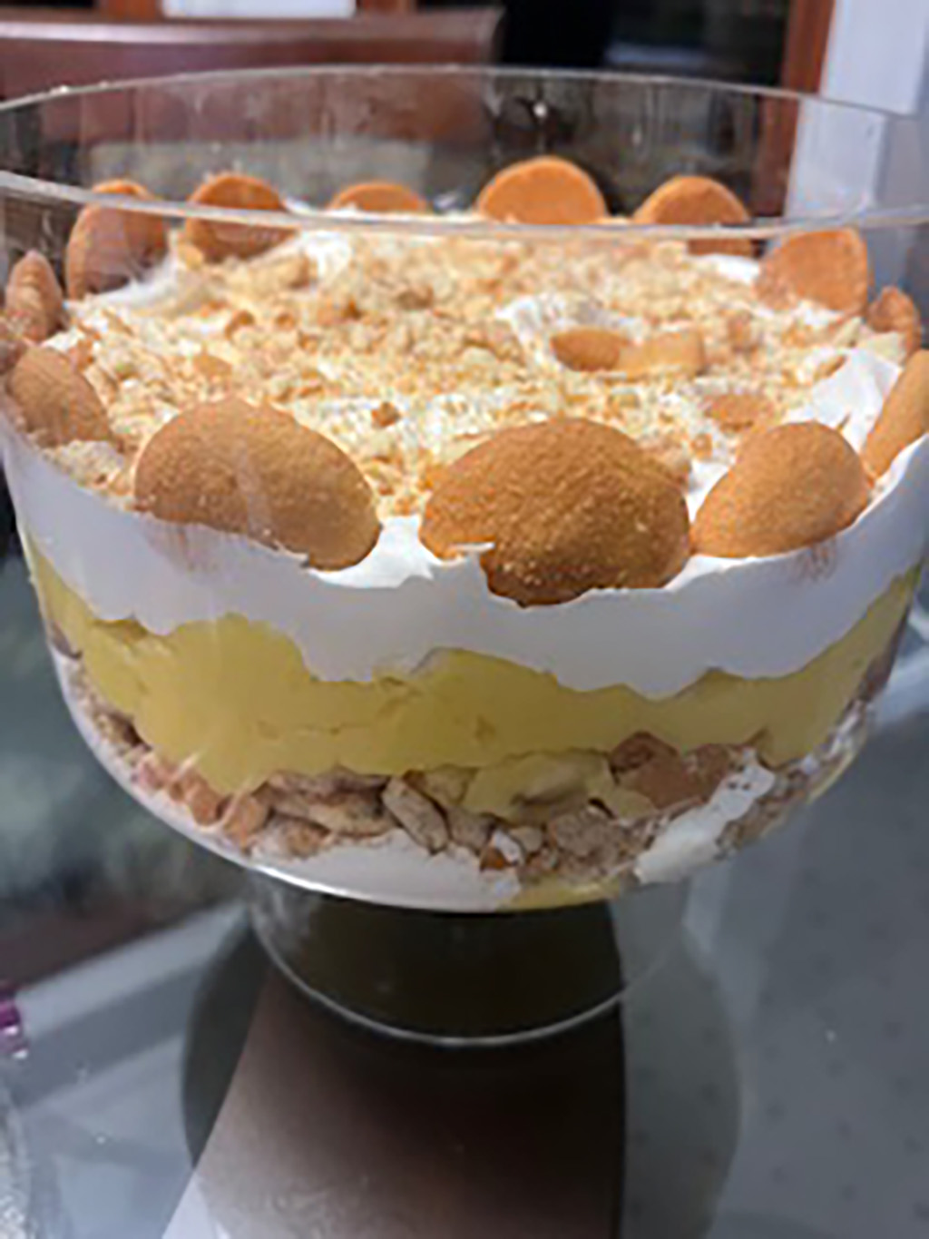 - In a trifle bowl, layer 1/2 each pound cake cubes, pudding, whipped cream mixture, and crushed vanilla wafers. Repeat layering with remaining 1/2 each cake, pudding and whipped cream; top with remaining 1/2 crushed vanilla wafers.