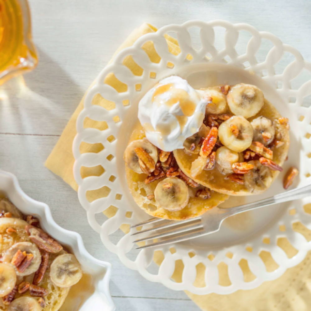 - Spread banana slices and pecans evenly over the muffins and drizzle the remaining syrup over the bananas.