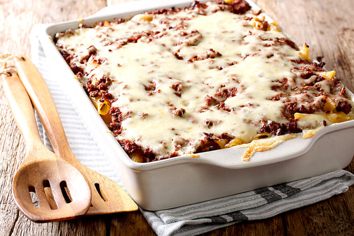 Spoon egg noodle mixture into a lightly greased 13-by-9-inch baking dish. Top with beef mixture; sprinkle with cheeses in order listed.