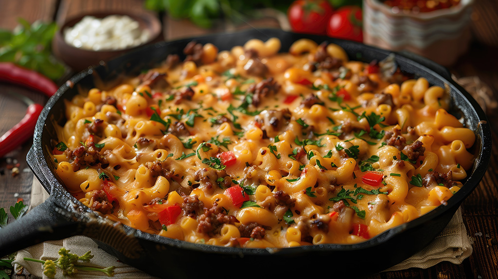 - Add in garlic and stir. Pour in the tomato sauce, diced tomatoes, beef broth, Worcestershire sauce, seasoned salt, Italian seasoning, bay leaves and dried macaroni noodles. Stir and bring the mixture to a boil.