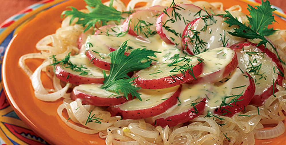 - To arrange salad, spoon onions onto plate, spreading into 10 to 12-inch round. Make overlapping circles of glazed sliced potatoes over onions. Spoon some of the dilled mayonnaise into center, and pass remainder in a small bowl.
