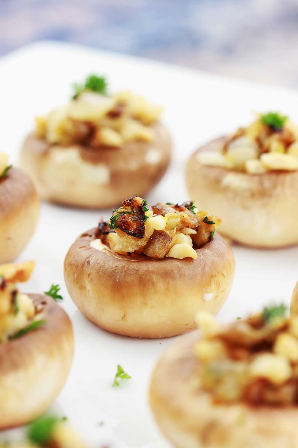 Cook bacon strips in a large skillet over medium heat until crispy; drain on paper towels. While the bacon is cooking, remove stems from mushrooms. Set caps aside, and chop stems. Add butter to skillet with bacon grease. When melted, stir in mushroom stems, onion, and garlic. Cook, stirring frequently until the onions caramelize, 15 to 20 minutes. Preheat oven to 350 °. Spray a small baking dish with cooking spray. Once onion mixture has reached a deep, rich brown color, place into a blender along with bacon, cream cheese, blue cheese, and bread crumbs. Blend on low until ingredients are roughly chopped and evenly combined. Stuff cheese mixture into mushroom caps and place into prepared baking dish. Bake until bubbly & lightly browned, 10-15 minutes.