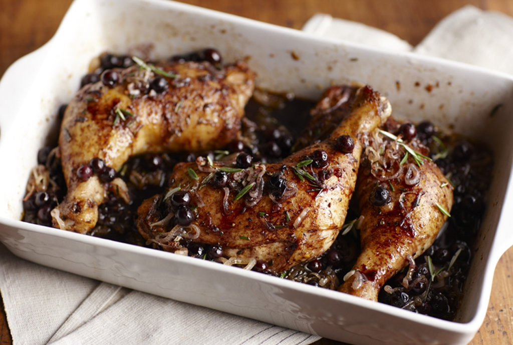 - Pour the blueberry balsamic mixture over chicken and put baking dish in the top half of the oven for about 10 minutes, until the chicken has cooked through to a temperature of 165°F.