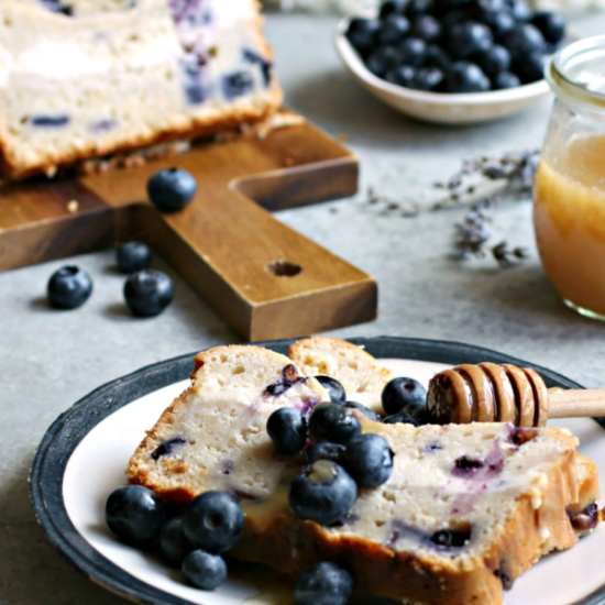 Pour half the blueberry batter into a greased loaf pan. Spoon on the cream cheese mixture, top with the remaining blueberry batter and gently swirl with a butter knife.