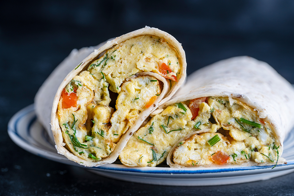 5. Lay each tortilla on a clean flat surface and fill with scrambled eggs, some of the veggie mixture and cheese. Fold into a tight burrito shape. Toast for 1 to 2 minutes per side with a teaspoon of olive oil or butter in the same pan until the outside is crispy and golden.