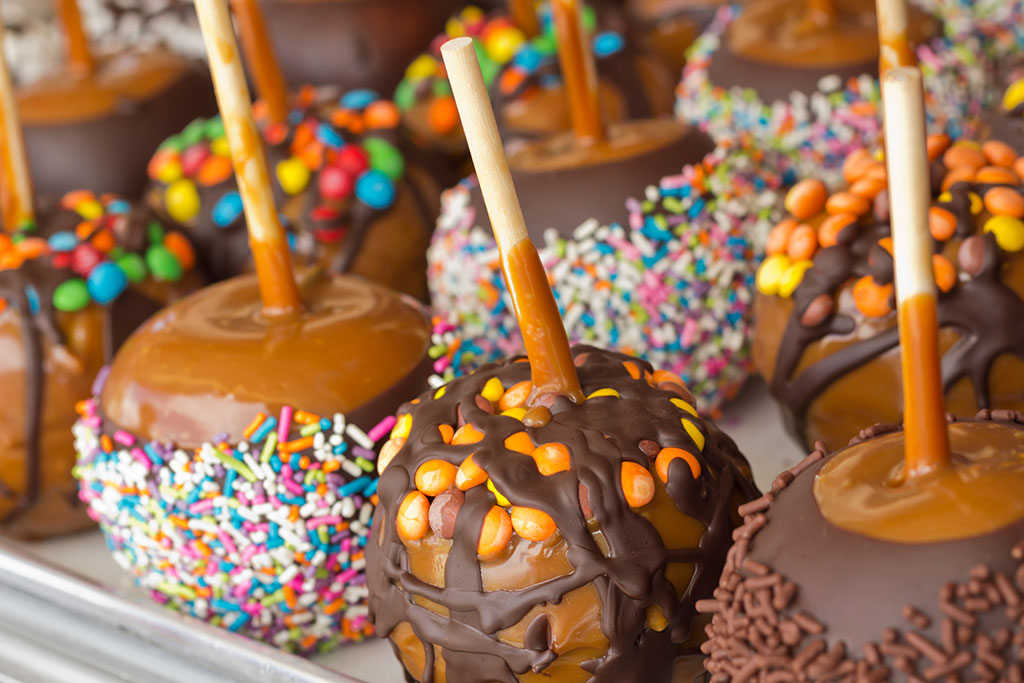 - Working quickly, dip each apple into the hot caramel to completely coat the apple and about 1/2 inch of the wooden handle. Sprinkle on desired toppings or nuts.