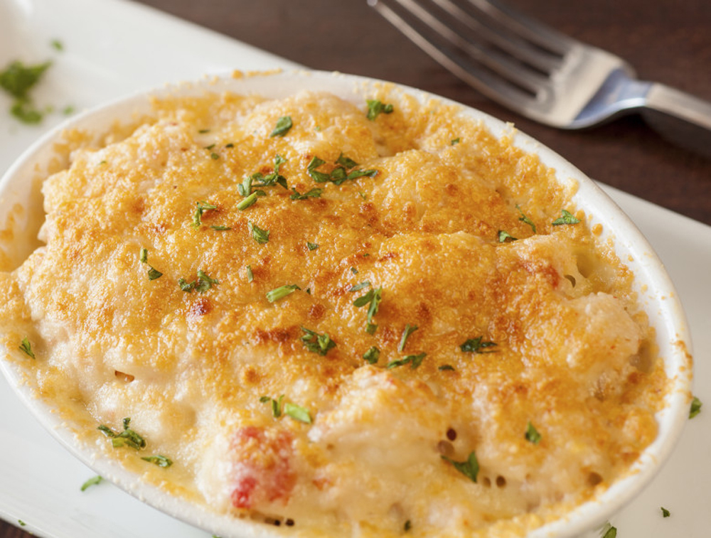 6. Pour the cheese sauce over the cauliflower and stir to coat. Sprinkle the lobster over the cauliflower and stir to coat. Sprinkle the panko bread crumbs evenly over the top of the casserole and then spray the top of the panko with cooking spray.