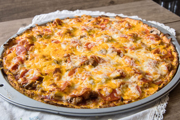 Place a 14-inch piece of parchment paper on a half-sheet pan. Pour 2 tablespoons of the oil onto the parchment and dust with the cornmeal. Place the cauliflower mixture onto the prepared parchment. Gently pat the crust into a 12-inch round.