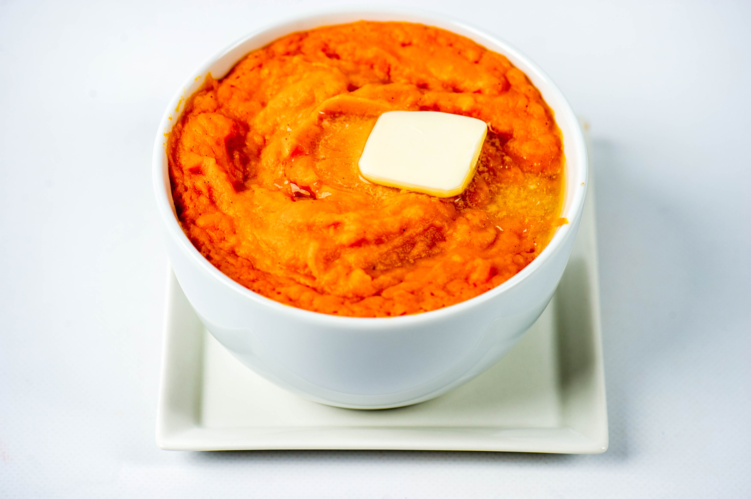 - In a large mixing bowl (or by hand with a potato masher), beat the cooked potatoes and garlic until mashed and smooth (do not overbeat).