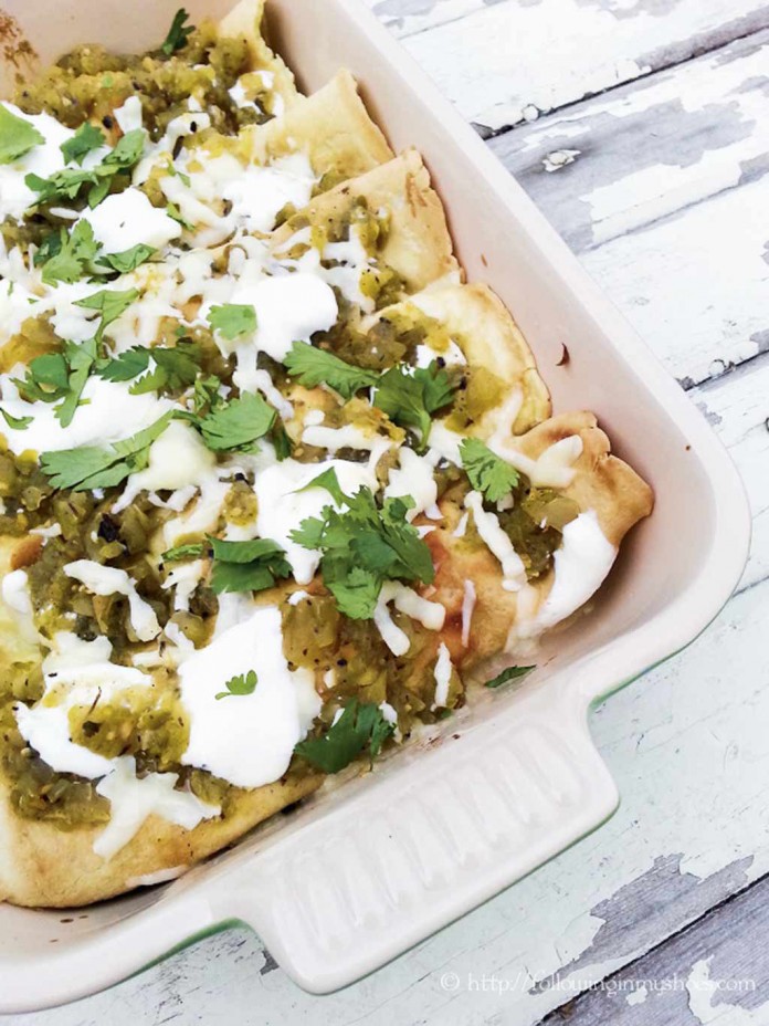 - Spread the Salsa Verde over the top of the enchiladas and then sprinkle with the remainder of the shredded cheese.