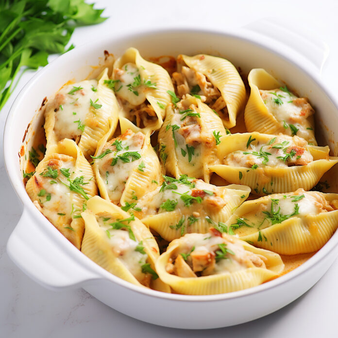 Lightly grease a 9-by-13-inch pan. Place a small amount of sauce to cover bottom of dish. Fill shells with filling and place in pan. Ladle half of sauce over filled shells.