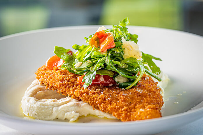 Fancy name for a lightly breaded chicken breast cooked until golden and juicy … pictured with mashed potatoes. Yum!
