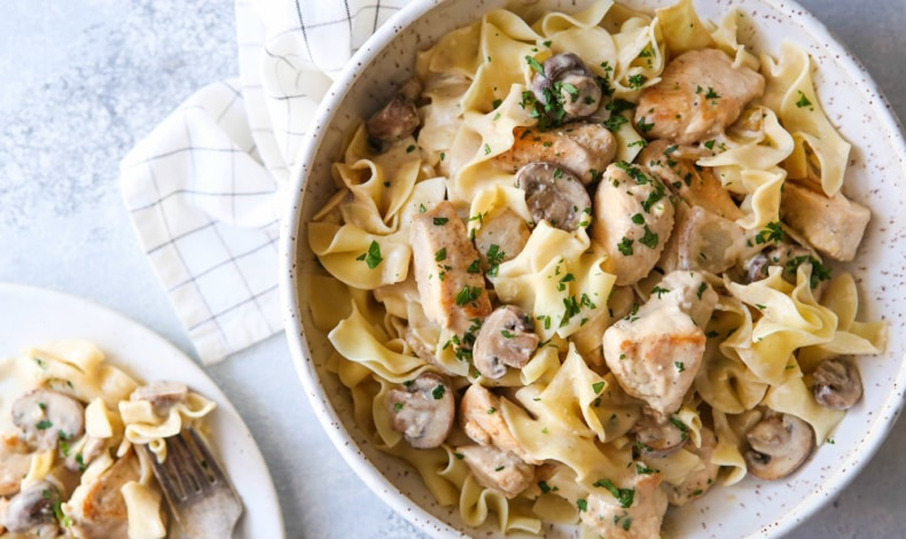- Add chicken and mushroom mixture back to pan. Cook 3-5 minutes or until chicken is cooked through. Add egg noodles, toss to coat in sauce and serve immediately. Garnish with parsley if desired.