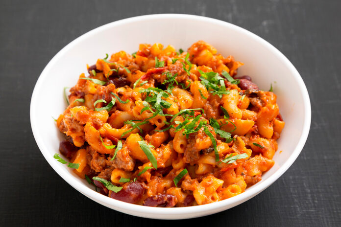 - Stir in chili, corn and macaroni; heat through. Sprinkle with cheese.