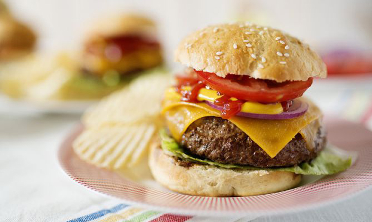 - Add patties to burger buns and dress with lettuce, tomato, onion, ketchup and mustard.