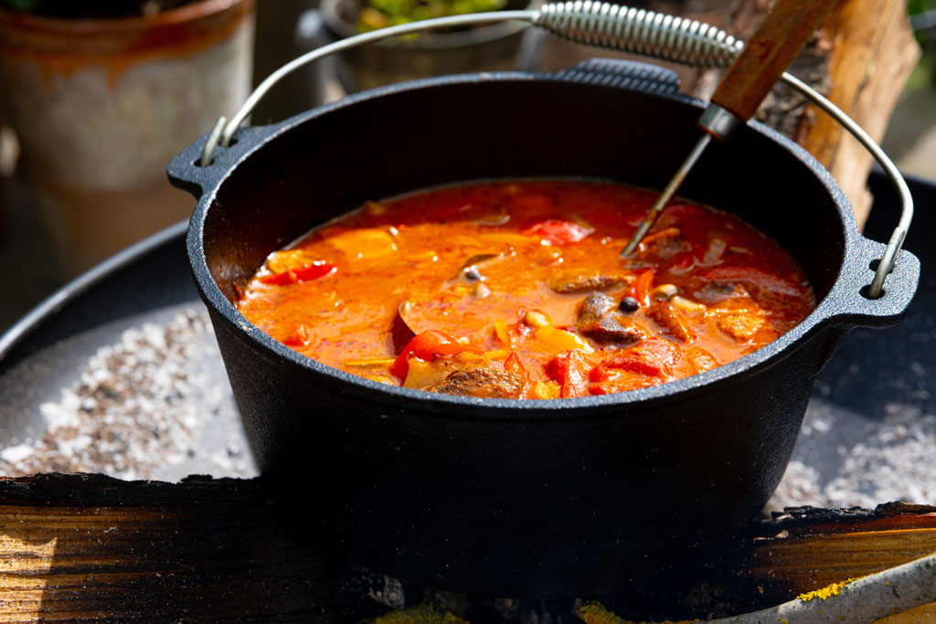 - Cook for about 10 minutes and check to see if the cornbread is done cooking by lifting the lid and poking a skewer through the cornbread. If it comes out clean the chili is done.