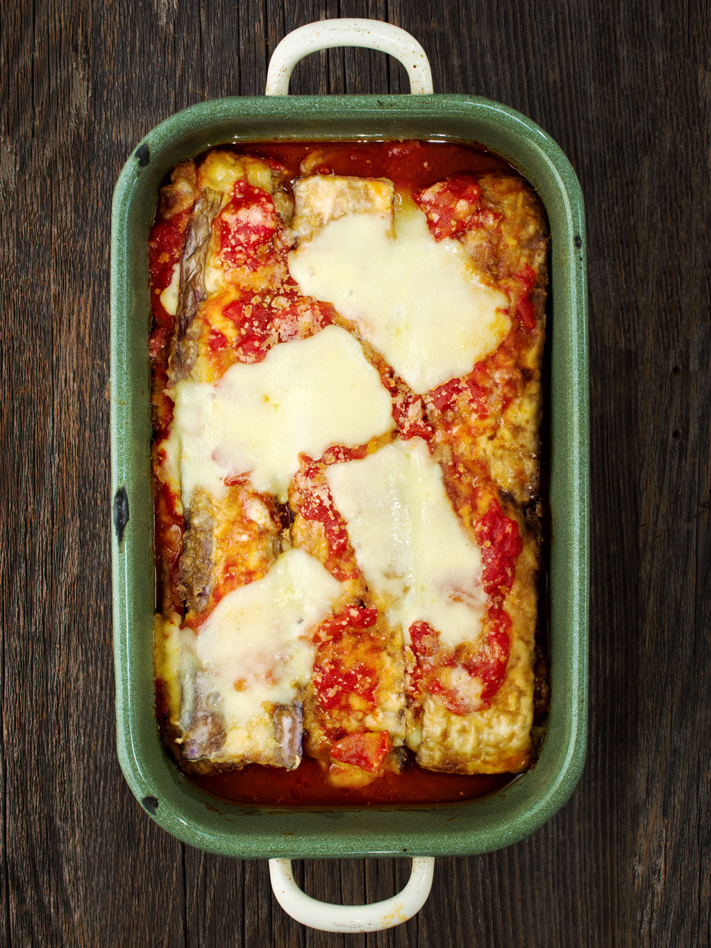 - Spread 1/2 cup sauce into a 13×9-in. baking dish coated with cooking spray. Layer with a third of the mushroom mixture, a third of the eggplant, 3/4 cup sauce and a third of the cheese mixture. Repeat layers twice. Bake, uncovered, at 350° 25-30 minutes or until heated through and cheese is melted. Yield: 8 servings.