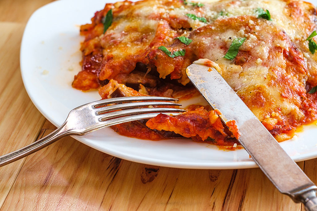 - Spread a couple of small scoops of the tomato sauce in the bottom of a 9-by-11-inch baking dish sprayed with non-stick coating. Loosely lay baked eggplant rounds over the sauce and then cover with half of the shredded cheese. Do a second layer and top with sauce and remaining shredded cheeses. Finish assembling the casserole with the remaining eggplant rounds and sauce.