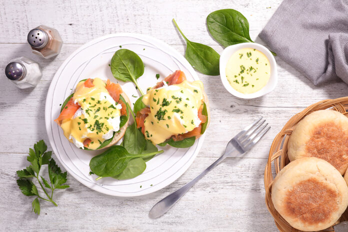 Make the sauce next. Add the egg yolks, lemon juice, Dijon mustard, salt and desired seasonings to a small blender. Blend about 30 seconds. The mixture should be very well incorporated and pale yellow in color. With the blender running, very slowly stream in the hot, melted butter until the hollandaise sauce is creamy, emulsified and has reached your desired consistency. For a thicker hollandaise, use 6 to 8 tablespoons butter. For a thinner hollandaise, use 8 to 10 tablespoons butter.