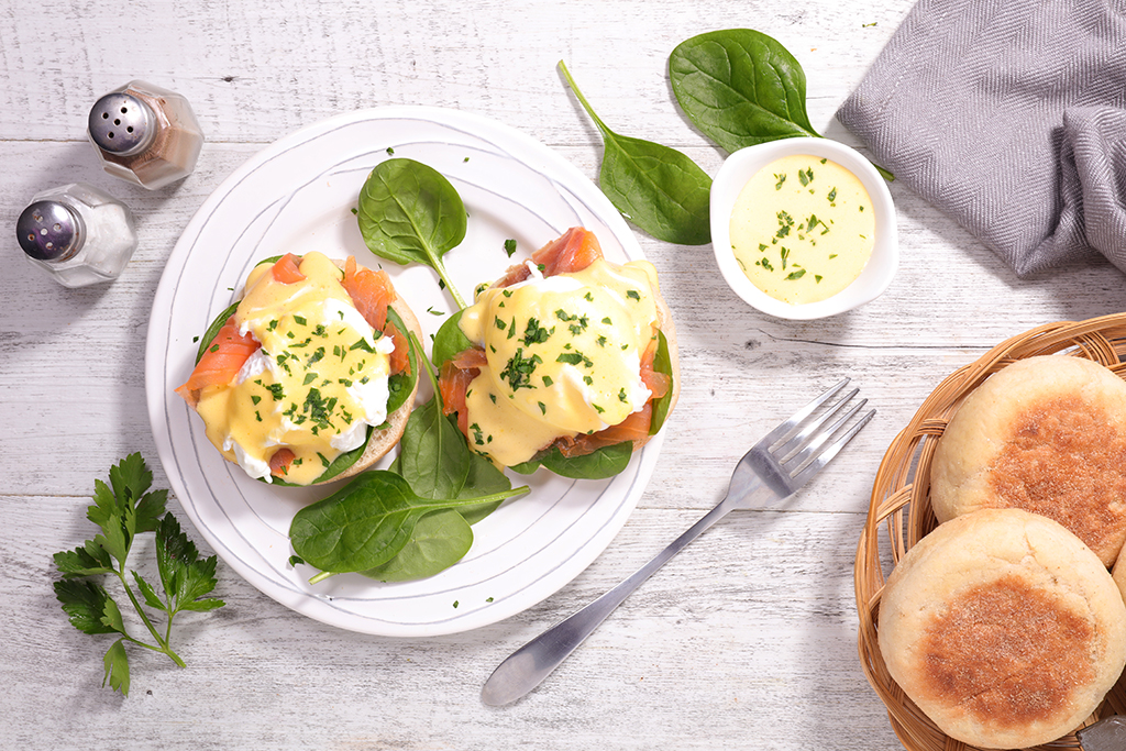 Top each toasted English muffin with toppings of choice. Place a poached egg on top. Finish with a spoonful of hollandaise sauce and garnish with parsley flakes, if desired. Serve immediately.