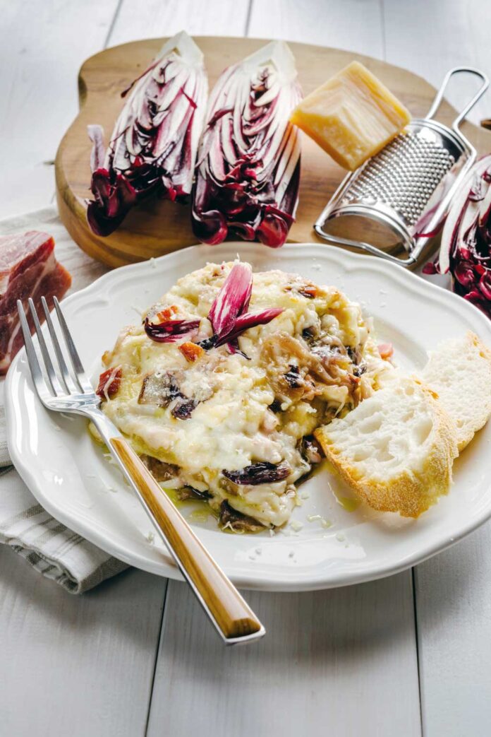 - In a medium bowl, combine ricotta, 1 teaspoon salt, all herbs and 1/4 cup of the prepared béchamel sauce.