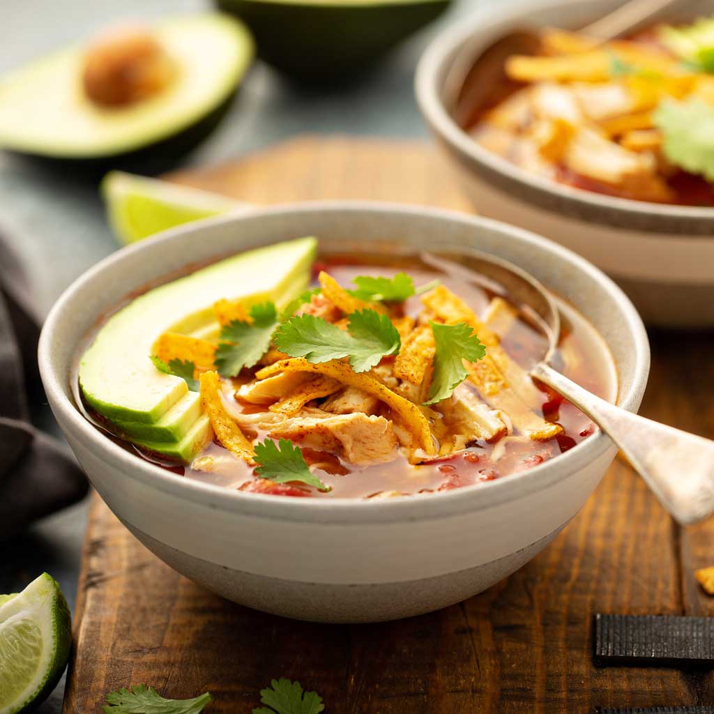In medium saucepan, cook and stir pork until browned. Drain. Add chicken broth, picante sauce, cumin and pepper; bring to boil. Reduce heat; cover and simmer 15 minutes, stirring occasionally. Stir in cheese soup; simmer until heated through. Do not boil. Pour into serving bowls; garnish with tortilla chips and sour cream.
