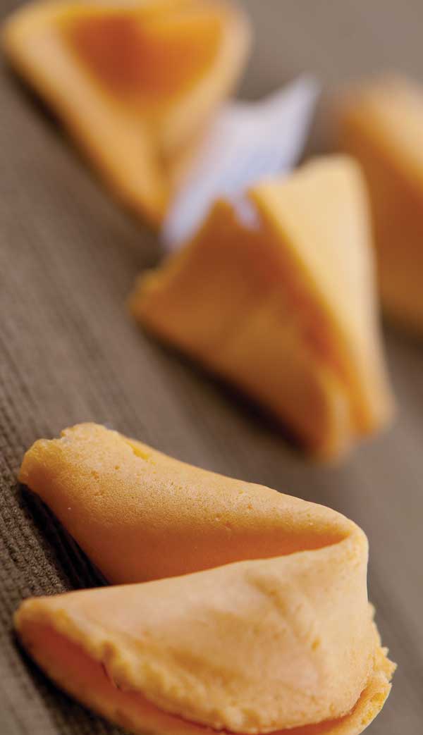 - Remove from oven and quickly move cookie with a wide spatula and place upside down on a wooden board. Quickly place the fortune on the cookie, close to the middle and fold the cookie in half. Place the folded edge across the rim of a measuring cup and pull the pointed edges down, one on the inside of the cup and one on the outside. Place folded cookies into the cups of a muffin tin or egg carton to hold their shape until firm.