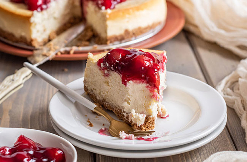 When cheesecake is cold, remove spring form sides and slice into 16 portions. Serve 1 tablespoon of cherries over cheesecake.