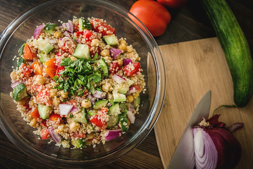 - In a medium bowl, stir together cooked quinoa, cucumber, parsley, mint, red onion, red pepper, pistachios, chickpeas, lemon juice, olive oil, salt, pepper and feta.