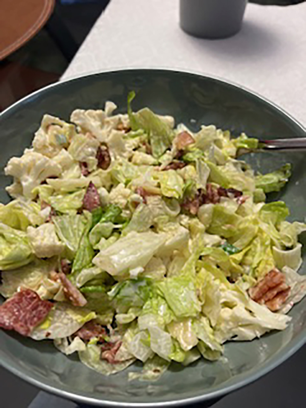 1. In a large bowl, combine lettuce, cauliflower, bacon and onion. Set aside.