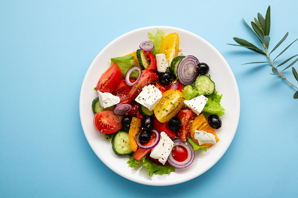 - On a large platter, arrange the cucumber, yellow pepper, cherry tomatoes, feta cheese, red onions and olives.