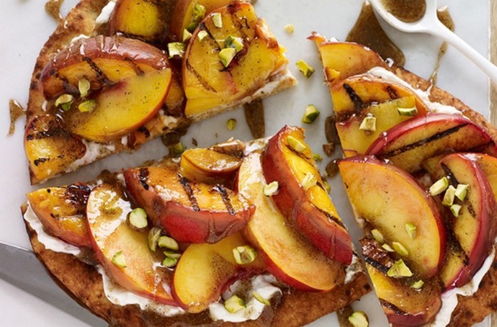 - Brush naan and peaches with honey mixture. Grill naan over medium heat 2 to 3 minutes per side or until toasted.
