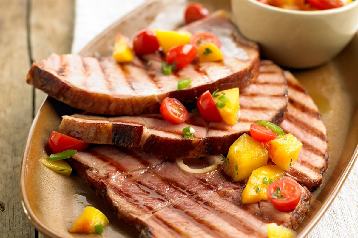 - Ham steak is definitely an underdog when it comes to summertime recipes, but this unique grilling idea is sure to be a hit once you give it a shot. The combination of the sweet homemade peach salsa recipe and the savory, salty grilled ham steak is the perfect complement to beautiful summer weather.