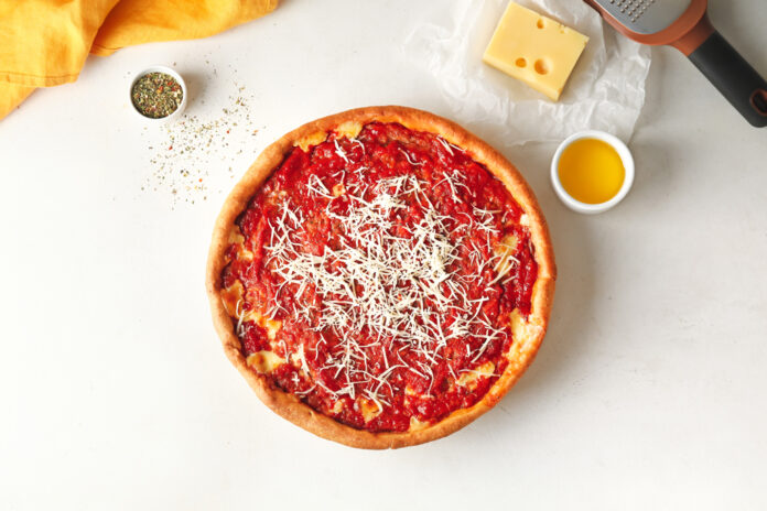 Roll out and stretch pizza dough on a lightly floured surface to a 12-inch circle. Press dough onto the bottom and about 1 inch up sides of a greased 10-inch springform pan. Spread pizza sauce on dough bottom. Sprinkle with fontina.