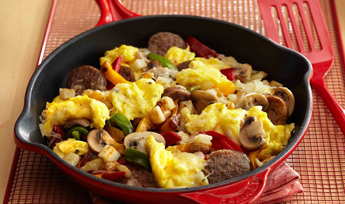 - POUR eggs over mixture in skillet. As eggs begin to set, gently pull the eggs across the pan with an inverted turner. CONTINUE cooking until eggs are thickened and no visible liquid egg remains. Do not stir constantly.