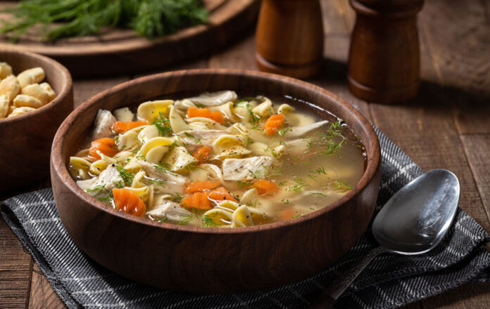 - Meanwhile, separate and tear the chicken it into bite-sized pieces, adding it back to the soup.