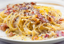 Spaghetti Carbonara Ingredients: ½ lb. pancetta or thick-cut bacon, chopped 2 cloves garlic, minced ⅓ cup dry white wine 3 eggs, room temperature, beaten well ½ cup parmesan cheese, grated Salt...