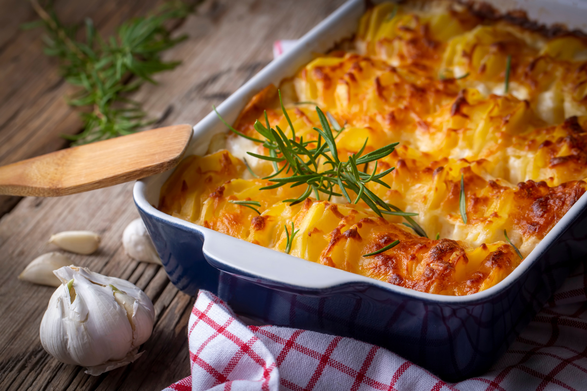 - In your greased baking dish, place some cheese sauce to cover bottom, layer cooked potatoes on bottom with a third of cheese sauce; repeat. Top with remaining shredded cheeses.