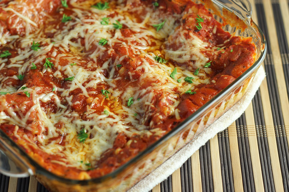 - Pour 1 cup of spaghetti sauce in bottom of pan.