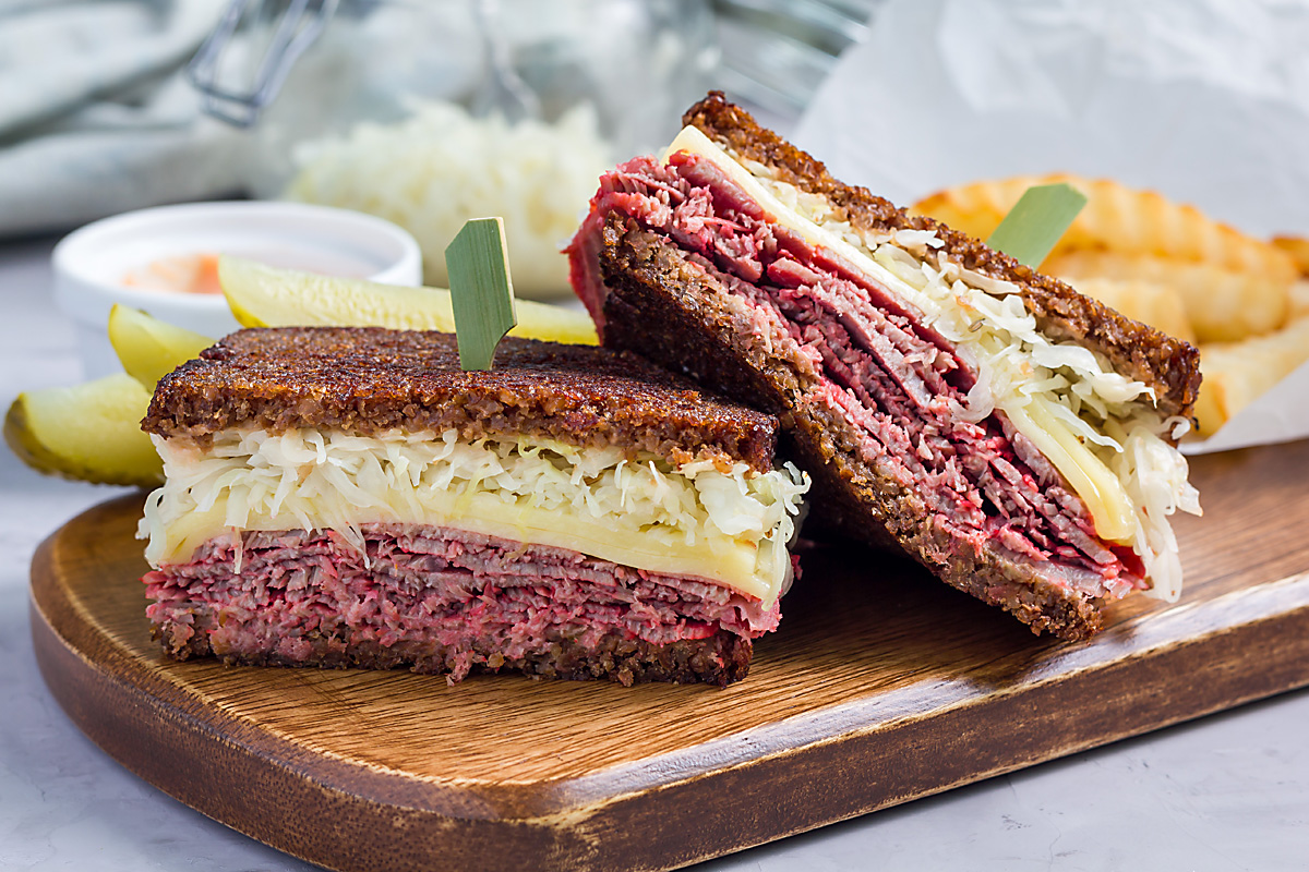 - Add ¼ pound corned beef to two of the slices of bread. Top the corned beef with ½ cup of sauerkraut and two slices of Swiss cheese. Place the other slices of bread on top, buttered side out.