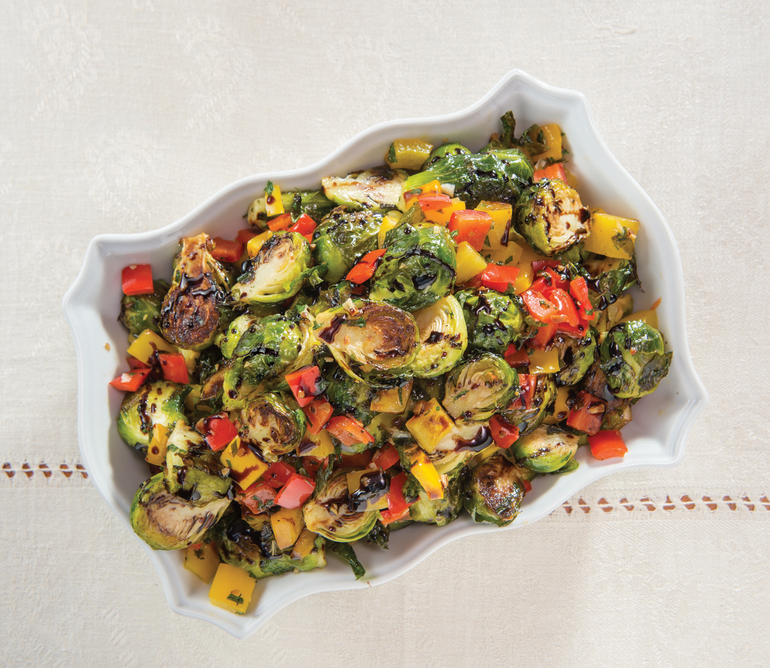 - Combine Brussels sprouts with all ingredients except peppers and balsamic syrup. Toss Brussels sprout mixture and season to taste with salt and pepper. Transfer mixture to sheet pan and roast in oven for 15 minutes. Stir sweet peppers into mixture and roast 5-10 minutes more.