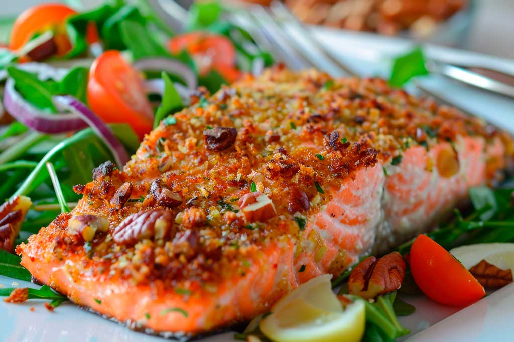 Sprinkle salmon with salt and pepper. Place skin side down on baking sheet. Combine mustard and honey, brush on top of salmon. Mix topping of breadcrumbs, nuts, and parsley and sprinkle over salmon. Bake at 400° for 10-15 minutes or until flaky. Garnish with wedges of fresh lemon. Serves 4.