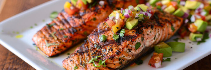 - Top salmon with peach avocado salsa.