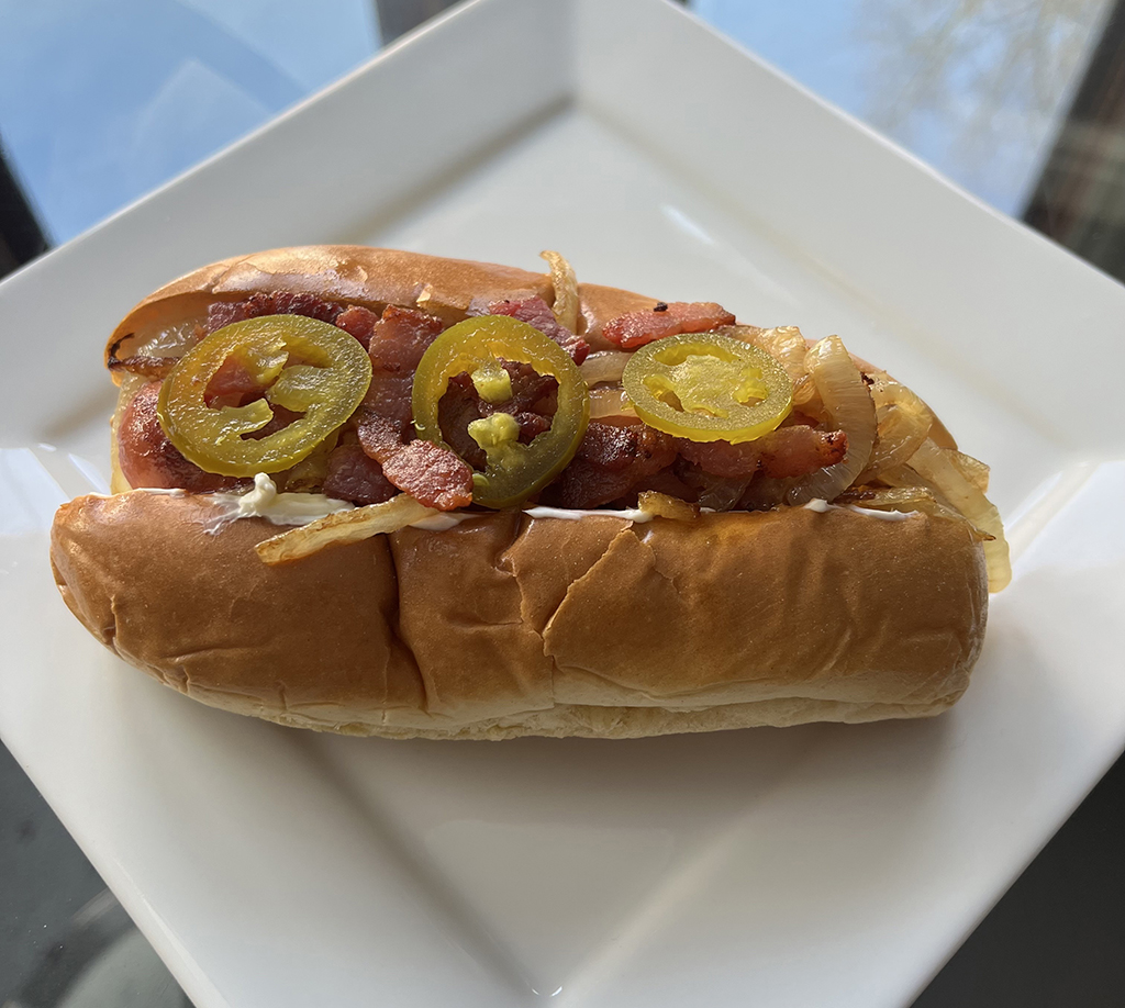 - Take one toasted bun and smear on cheese cream and top with bacon pieces. Place a hot dog in the bun and top with caramelized onions and jalapeños