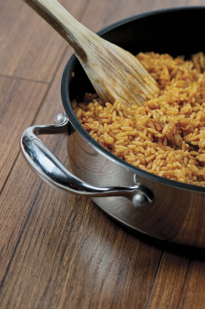 - Stir in the spices, rice, tomatoes with juice, and water.