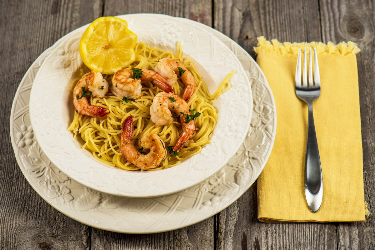- Drain pasta and mix in large skillet with shrimp and spinach, about 1 to 2 minutes.