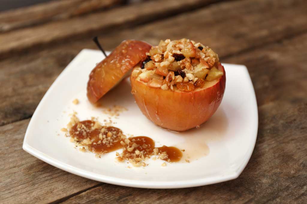- Combine dates, walnuts, mandarin oranges, and butter. Stuff filling into the apples and pour the remaining maple syrup over the top of the apples and filling continue cooking for 10 minutes.